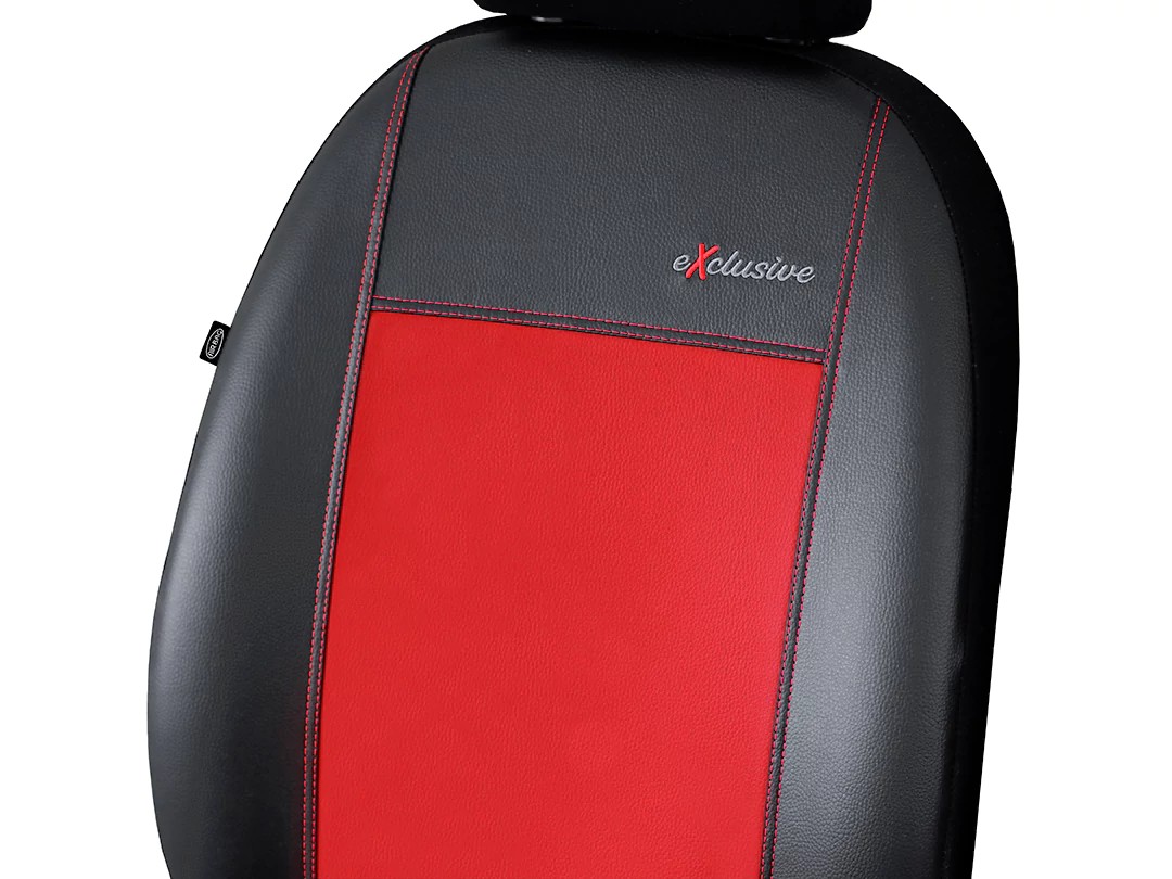 Az Exclusive bőr üléshuzatok esztétikus dupla varrással készülnek, amik amellett, hogy egyedi designt adnak, a időtállóságra is jótékony hatással vannak. Minden huzatot nem hivalkodó Exclusive hímzés díszít. A huzatok anyaga mind a külső, mind a színes belső részén kiváló minőségű textilbőrből (tehát nem valódi bőrből készülnek), amik közül a külső rész fekete színű, a belső rész pedig 7 féle szín közül választható. A fejtámlák színe fekete, anyaga szövet.